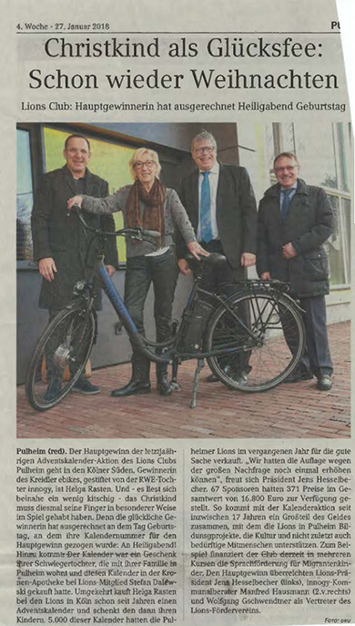 Elektromobil ins Frühjahr geht es für Helga Rasten aus der Kölner Südstadt. An ihrem Geburtstag, am 24. Dezember, gewann sie mit ihrem Adventskalender vom Lions Club Pulheim den diesjährigen Hauptgewinn, das von der Innogy SE gesponserte Elektrofahrrad.