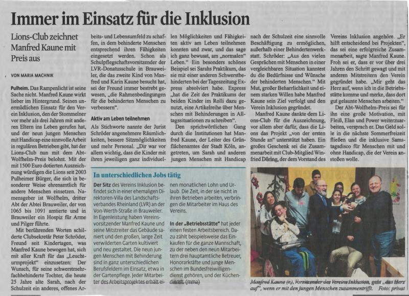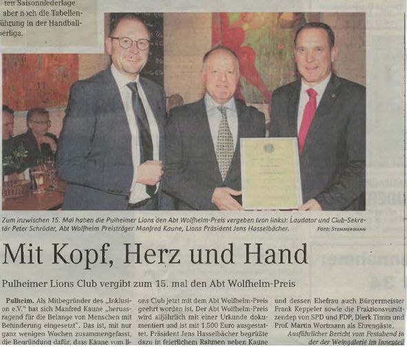 Lieber Manfred, ich darf dir und dem Inklusion e.V. stellvertretend für den ganzen Lions Club Pulheim hiermit den Abt Wolfhelm Preises des Lions Club Pulheim für dein und euer ehrenamtliches Engagement überreichen. Wir wünschen dir und dem Inklusion e.V. weiter viel Erfolg bei eurer Arbeit und freuen uns immer einmal wieder zum Gelingen eures Projektes beitragen zu dürfen.
