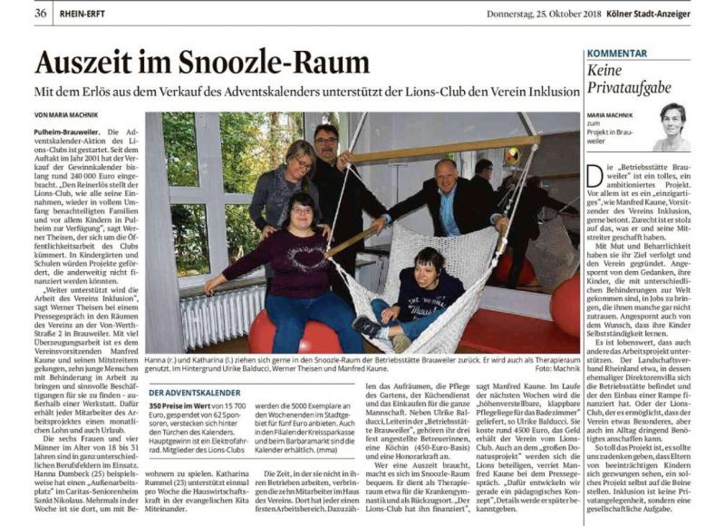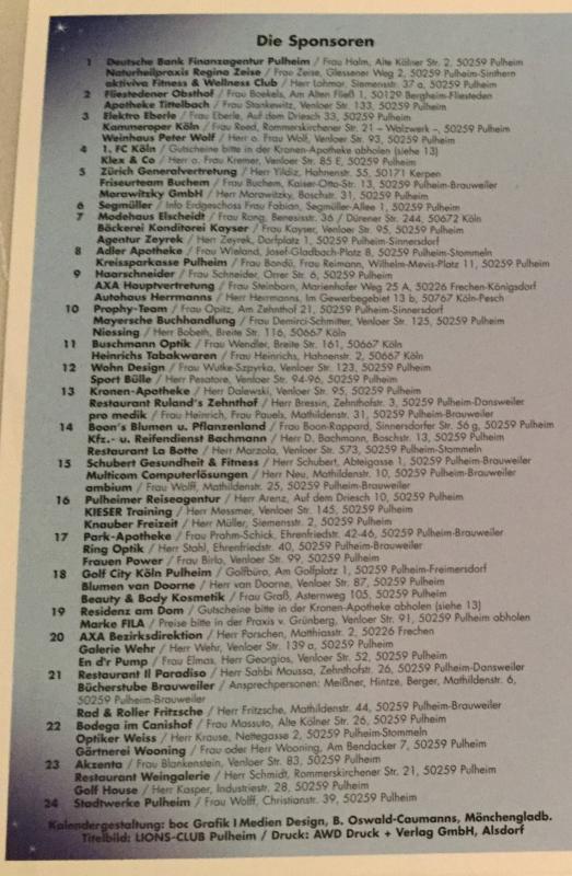 Zum achtzehnten Mal veranstaltet der Lions Club Pulheim  in diesem Jahr seine Adventsgewinnkalender-Aktivität. Der Verkauf der Kalender hat begonnen und wird rechtzeitig vor der Adventszeit beendet sein. Die Kalender sind in Pulheimer Geschäften, bei den Lions Mitgliedern und im Straßenverkauf zu erwerben. Die Auflage beläuft sich in diesem Jahr auf 5.000 Stück. Der Verkaufspreis beträgt, wie seit Beginn der Activity, 5 Euro pro Stück.