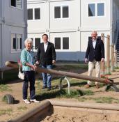 Die Ideengeberin Ingrid Rodig und Jost Halm, Präsident des Lions-Clubs Pulheim, besuchten mit Bürgermeister Frank Keppeler den neuen Spielplatz an der Flüchtlingsunterkunft.