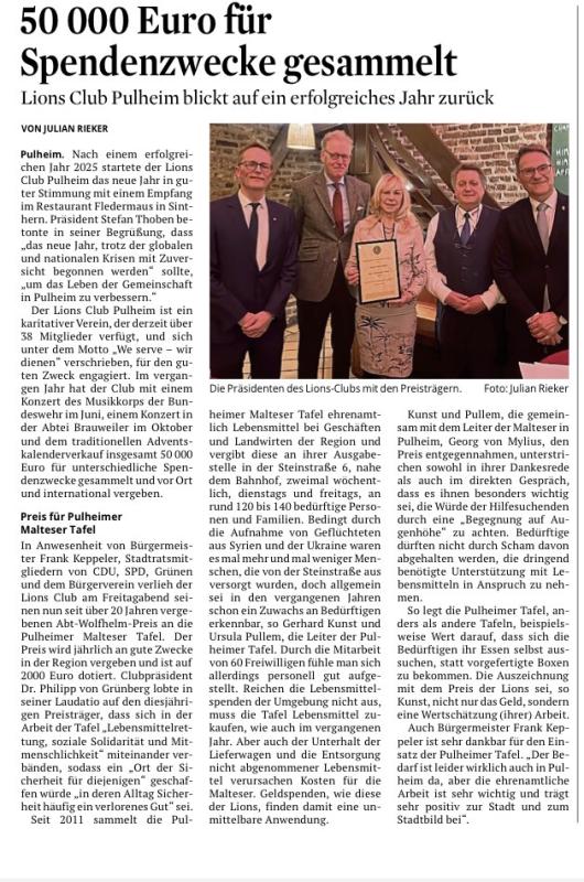 Im feierlichen Rahmen des Neujahrsempfangs, im Weinhaus Die Fledermaus in Sinthern, durfte der Lions Club Pulheim am 23. Januar eine ganz besondere Ehrung vornehmen: die Verleihung des Abt-Wolfhelm-Preises,  der seit nunmehr 30 Jahren außergewöhnliches ehrenamtliches Wirken würdigt. Der Preis ist mit einer Urkunde und einer Geldgabe von 2.000 Euro ausgestattet.