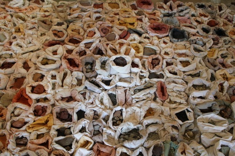 Blickfang auf dem Boden ihres luftigen Düsseldorfer Ateliers ist eine Installation: weiße Leinensäckchen dicht an dicht, gefüllt mit vielfarbigen Erdproben aus aller Welt – Indien, Madagaskar, Island, Asien, Australien, dem Jemen, der Sahara. In jedem Land verbrachte Ulrike Arnold Wochen oder Monate und machte sich künstlerisch zunutze, was sie vorfand. Auf ihren bewusst einsamen, entbehrungsreichen Streifzügen lernte sie, wie man Ängste überwindet und dadurch neue Erkenntnisse gewinnt. "Ist es nicht eine wunderbare Erfüllung, genau das umzusetzen, was man in sich fühlt?" fragt sie.