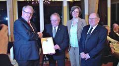 Er sagte dann weiter, „wir wollen heute Abend eine Ehrung vornehmen, die in unmittelbarem Zusammenhang steht mit dem Wort Christi: ‚Ein neues Gebot gebe ich Euch, dass ihr einander liebt, wie auch ich Euch geliebt habe!‘ Ja, es trifft zu. Wir ehren Handlungen, die in unmittelbarem Bezug stehen zu dem Gebot der Nächstenliebe…“ Weiter: „Arbeit in einem Hospiz kommt dem am Nächsten, was der Preisträger in Brauweiler vor vielen hundert Jahren als erste Amtshandlung nach seiner Wahl zum Abt getan hat, eine Anlaufstelle ins Leben zu rufen für Menschen, die alleine mit dem Lebensweg nicht mehr fertig werden…“ Dann übergab Dr. Bernhard Worms den Repräsentanten des Hospiz Pulheim die Auszeichnung. Der Vorsitzende Werner Weiland, Frau Schwenzer und der Ehrenvorsitzende Hans-Jakob Wolff bedankten sich dafür.