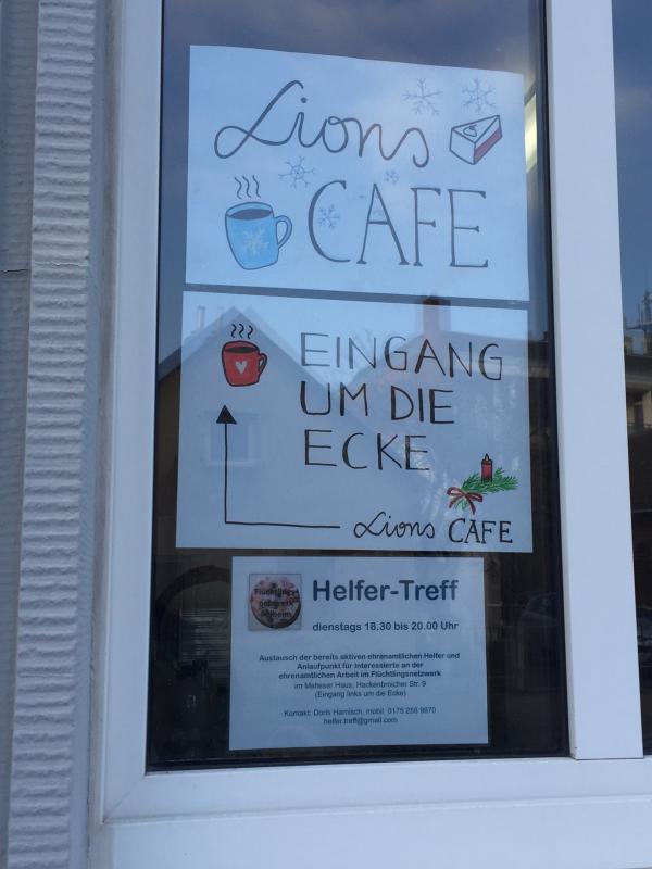 Im Rahmen des Lions Café werden Gesprächsangebote gemacht, mit Kleidung und Spielzeug ausgeholfen und in kleinem Umfang Deutschunterricht angeboten. Zusätzlich werden Kontakte zur sonstigen Hilfe, zu Behörden und Sprachkursen vermittelt.